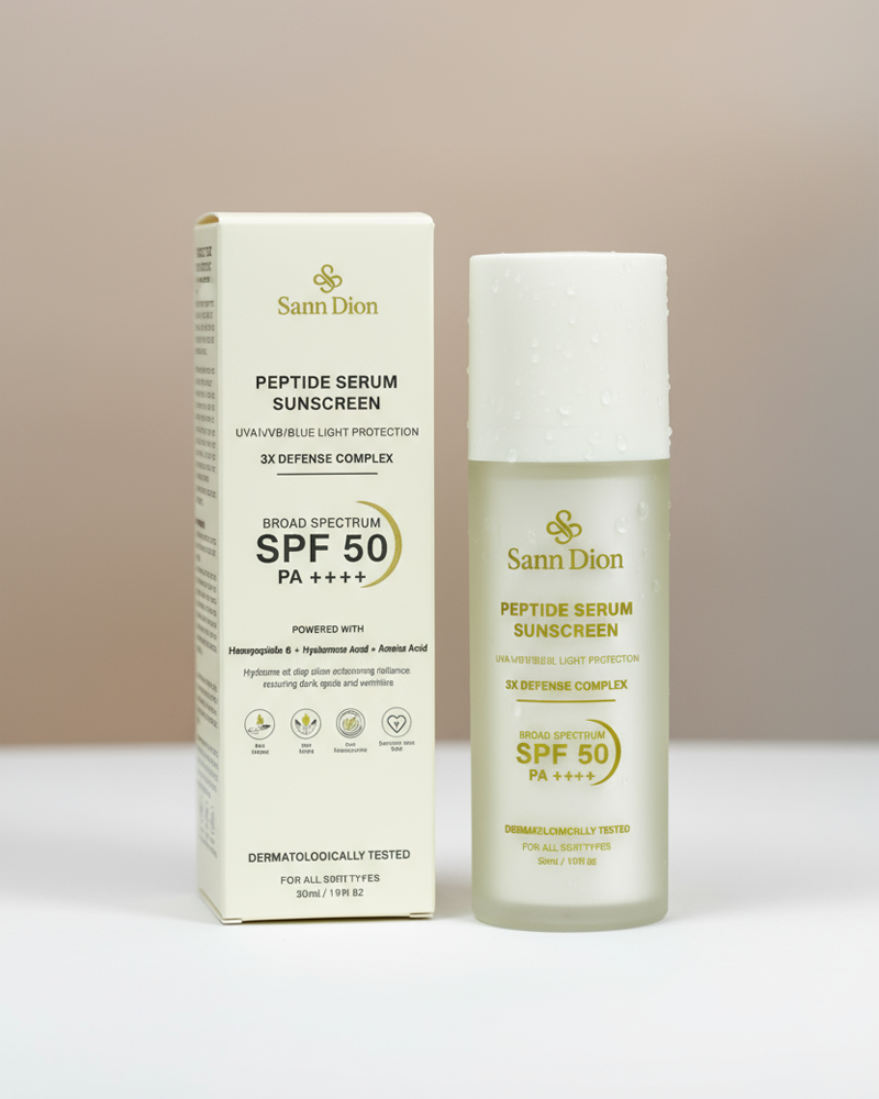 Meet the Sann Dion All-In-One Peptide Serum Sunscreen SPF50 PA++++ — your complete daily shield against harmful UVA, UVB, and blue light. More than just sun protection, this lightweight formula hydrates, brightens, and soothes your skin while refining pores and reducing fine lines.